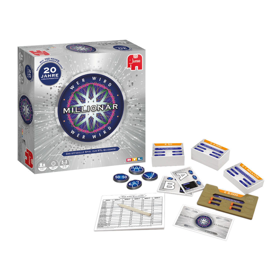 „Wer wird Millionär?“ begeistert seit über 20 Jahren das deutschsprachige Fernsehpublikum. Seit dem Start am 3. September 1999 prägte die Quizshow das Genre und inspirierte auch zahlreiche Brettspiele. Die Regeln sind identisch mit dem TV-Format: Ein Spieler übernimmt die Rolle des Quizmasters, die anderen stellen sich Fragen, beginnend bei 50 Euro bis hin zur kniffligen Millionenfrage.