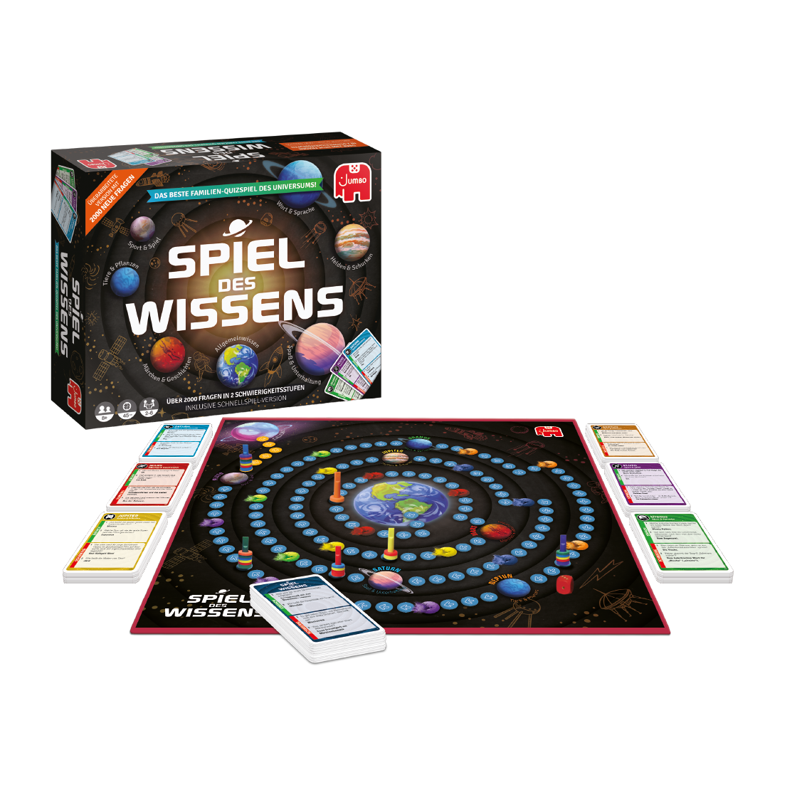 Spiel des Wissens ist seit über 30 Jahren eine bewährte Spiele-Ikone, die 2023 modernisiert wurde – kein neues Produkt, sondern eine aktualisierte Version mit frischem Verpackungsdesign und über 2.000 neuen Fragen in sechs Wissensgebieten. Dank zwei Schwierigkeitsstufen eignet es sich perfekt für Familien-Duelle. Das Spielbrett ermöglicht sowohl eine ca. 45-minütige Standardrunde als auch eine 20-minütige Schnellrunde. Im bekannten Weltraum-Szenario sammeln Spieler Planetenringe, um als Erste den Planeten Galaxia zu erreichen.